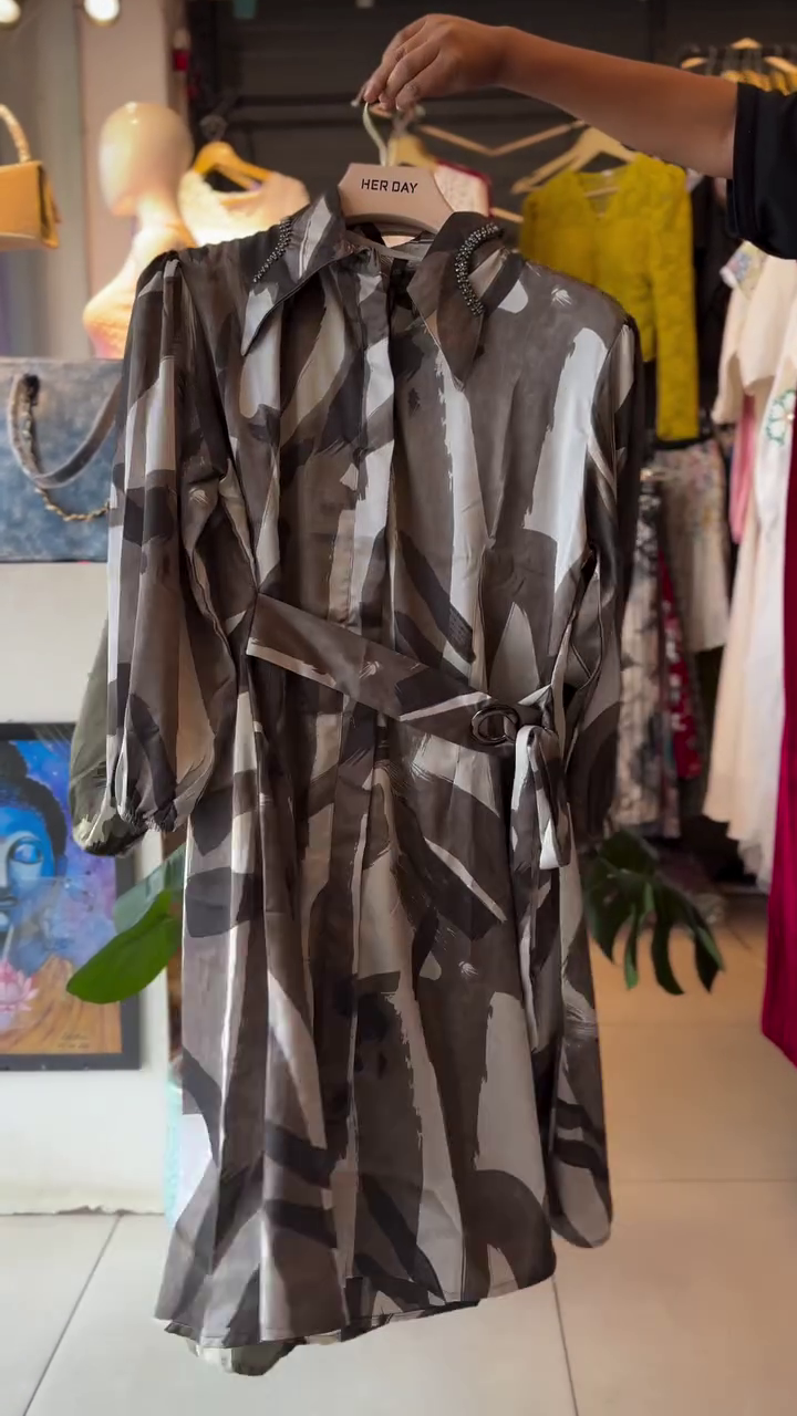 The dress showcases a collared neckline, full sleeves, and a matching belt that cinches the waist for a flattering fit. Its abstract print adds visual depth while the neutral palette keeps it versatile.