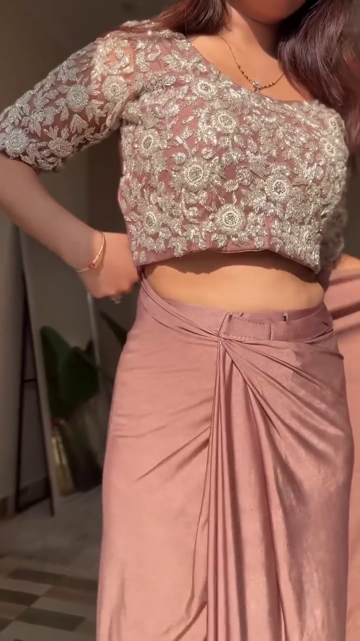 Step into effortless glam with this breathtaking Dusty Rose Ready-to-Wear Drape Saree, designed for the modern woman who loves traditional elegance fused with contemporary convenience. This gorgeous ensemble features a beautifully pre-pleated saree that drapes naturally, offering an instantly stylish silhouette without the hassle of traditional draping. The serene dusty rose tone adds a soft, romantic appeal, perfect for evening celebrations and festive gatherings.