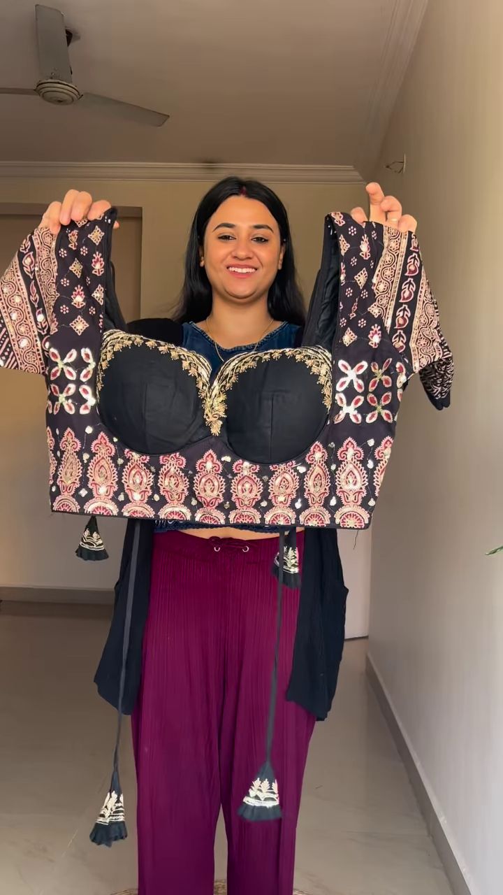 Designer Fusion Blouse: Features a bold black base with a mix of traditional patterns on the sleeves and a modern, halter-style sweetheart neckline adorned with golden embroidery.