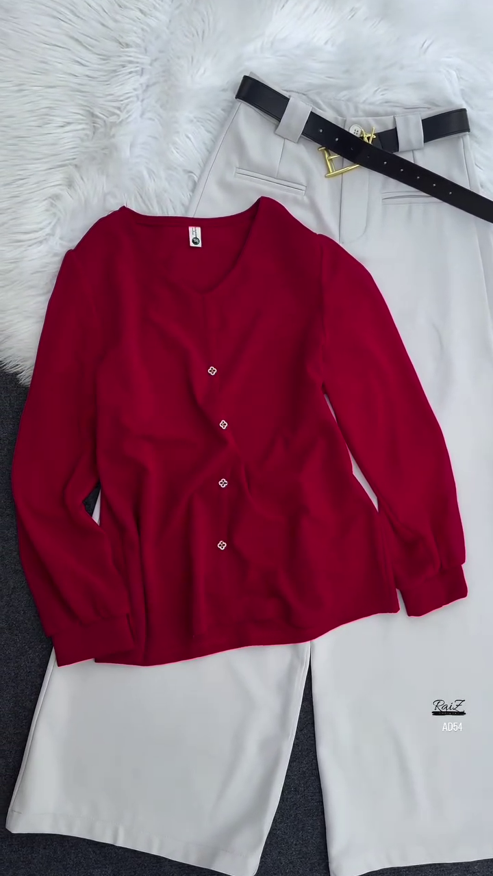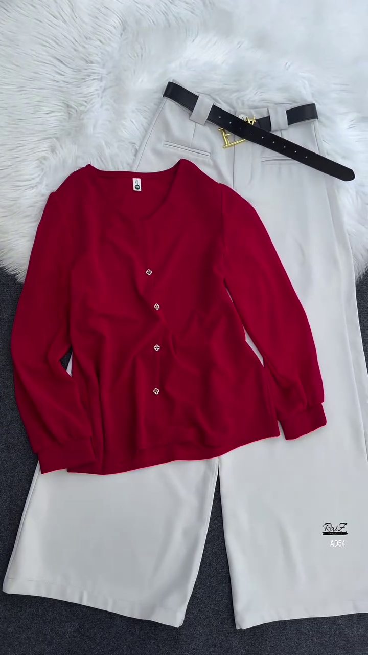 Whether styled together for a coordinated look or worn separately to create multiple outfits, the AD54 Olive Green Button-Down Blouse & Cream Wide-Leg Trousers Set is a wardrobe staple that effortlessly blends comfort, elegance, and modern versatility.