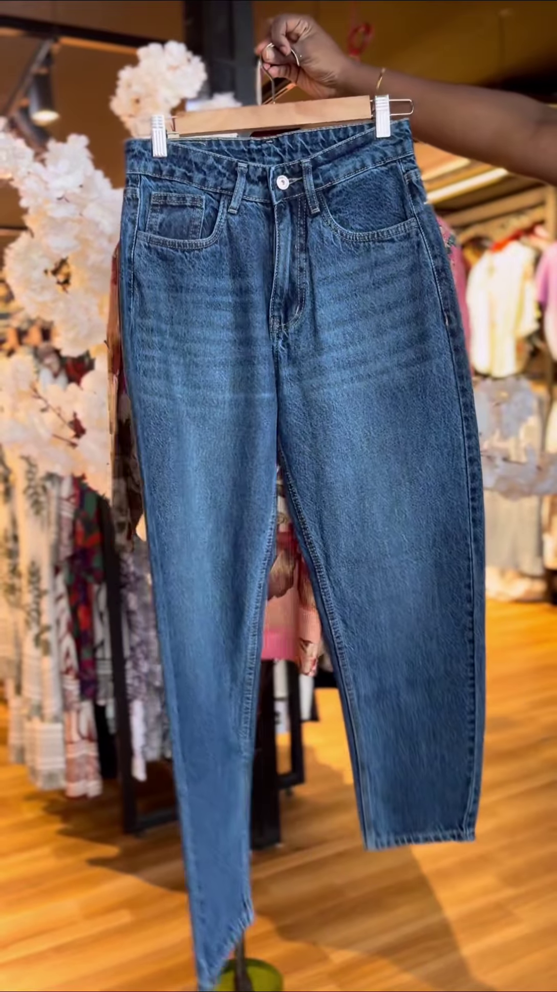 Balancing the top’s intricacy are timeless blue high-waisted jeans. With a structured cut that elongates the legs and emphasizes the waist, these jeans offer flattering lines and essential versatility. The fitted design hugs at the waist and tapers gently along the hips and thighs—perfect for pairing with oversized tops, cropped sweaters, or tucked blouses. Belt loops and a visible front button add utility and styling options for casual accessorizing.