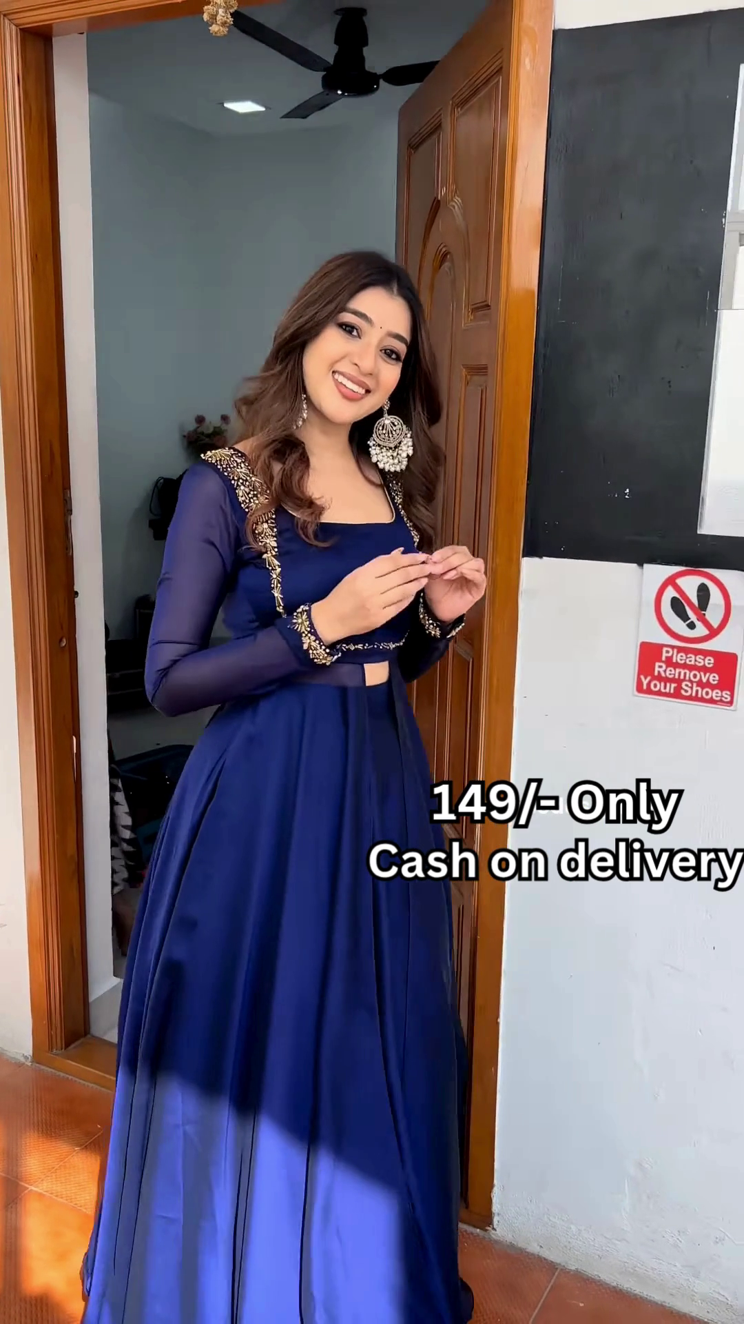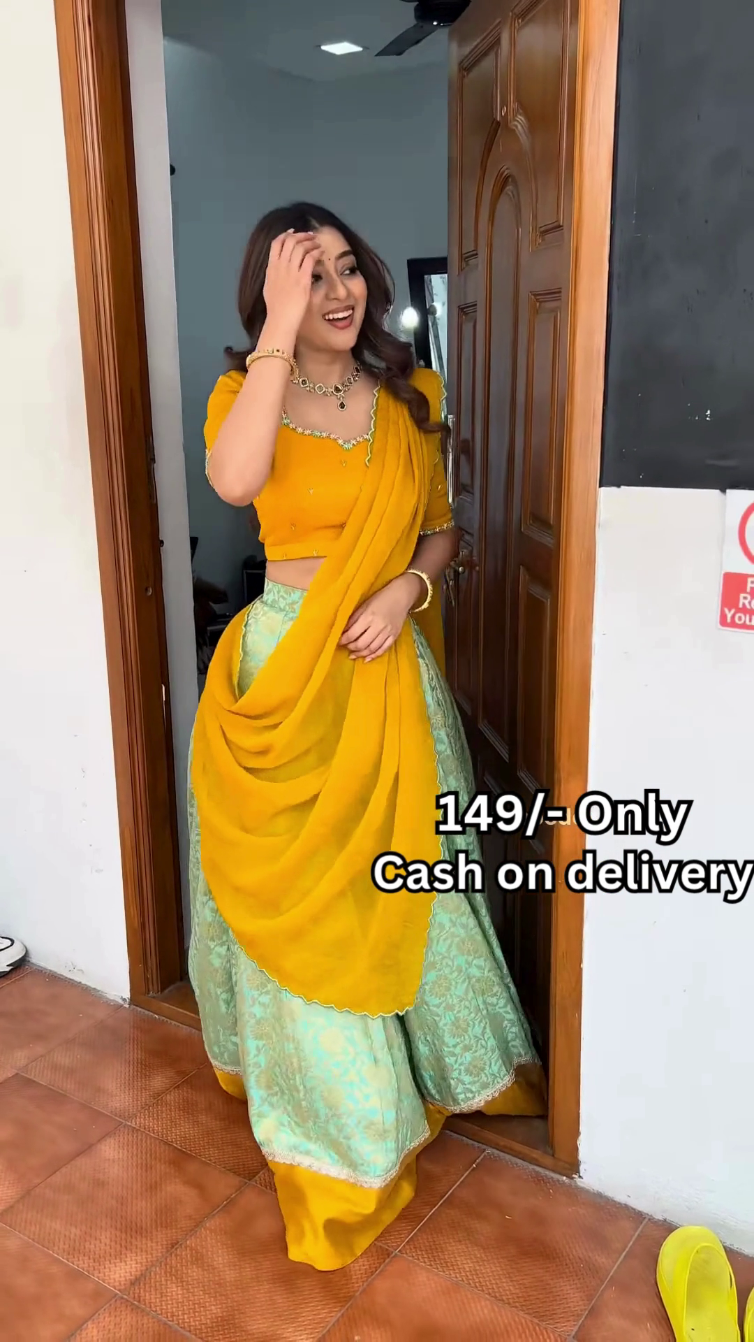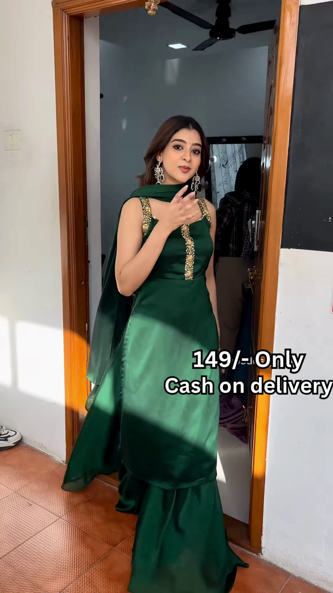 The doorway backdrop enhances the narrative—evoking intimacy, tradition, and connection. It frames the outfit in a relatable lifestyle context while preserving visual clarity for catalog or online display purposes. Whether styled for festivals, pre-wedding edits, or casual cultural sessions, this outfit embodies versatility across age groups and fashion genres.